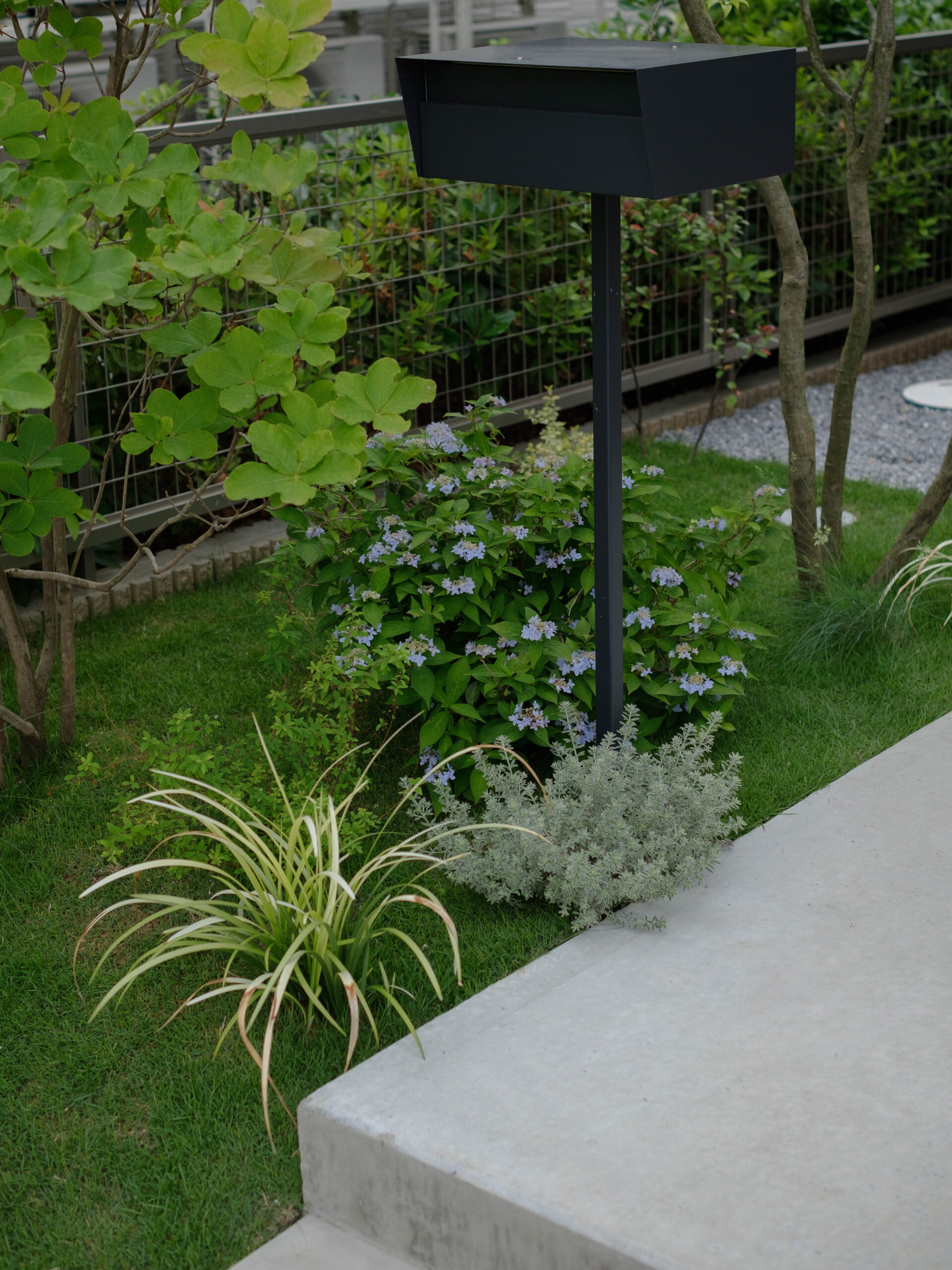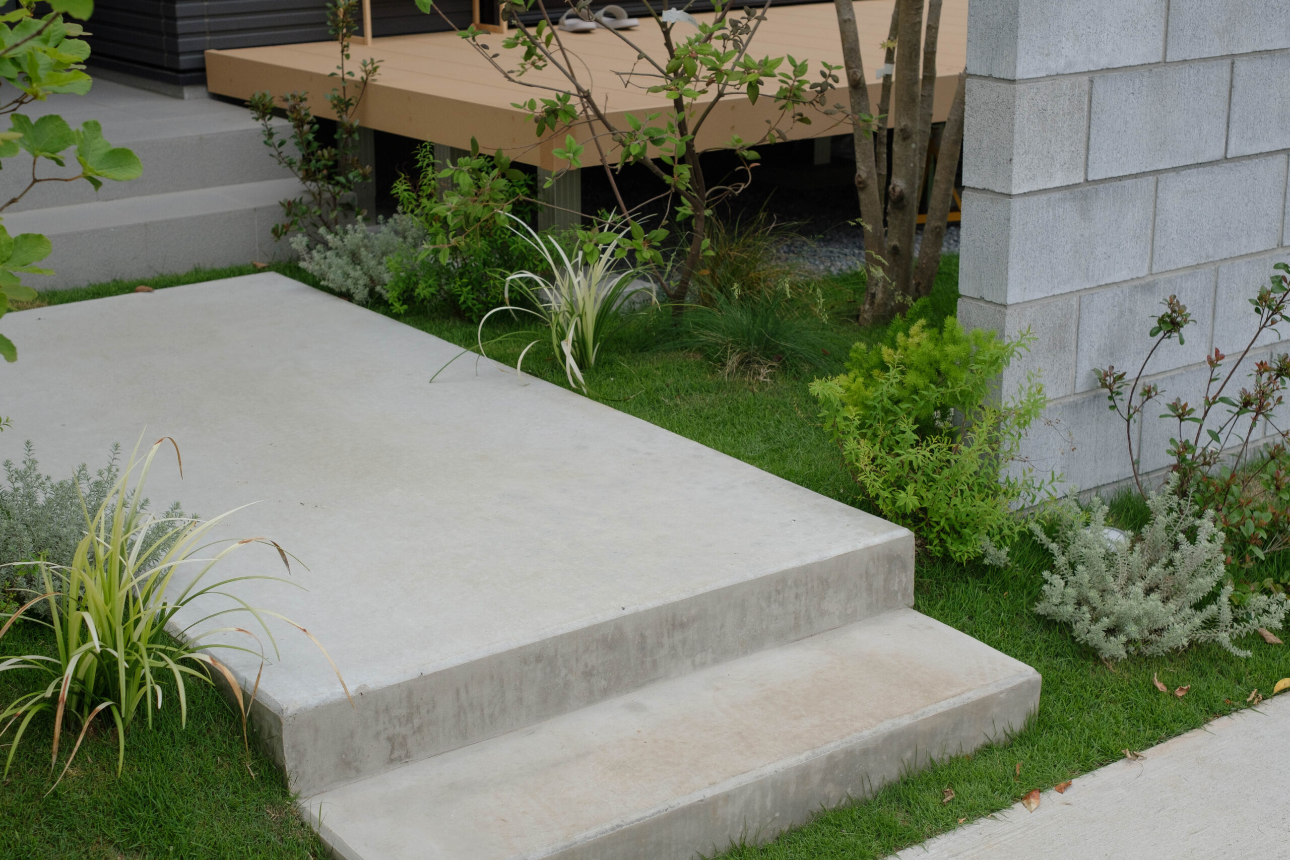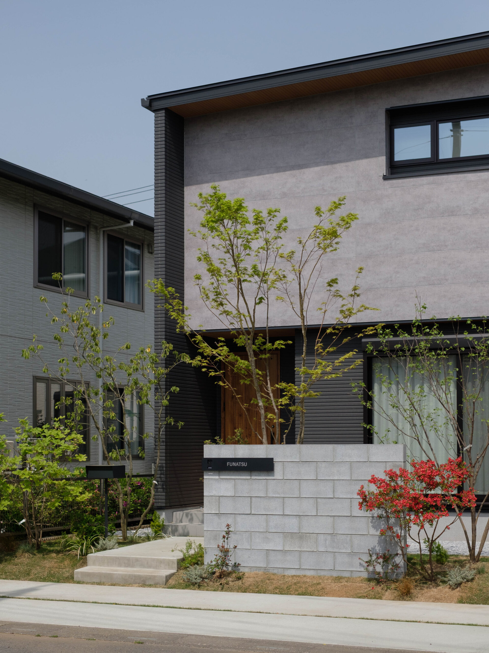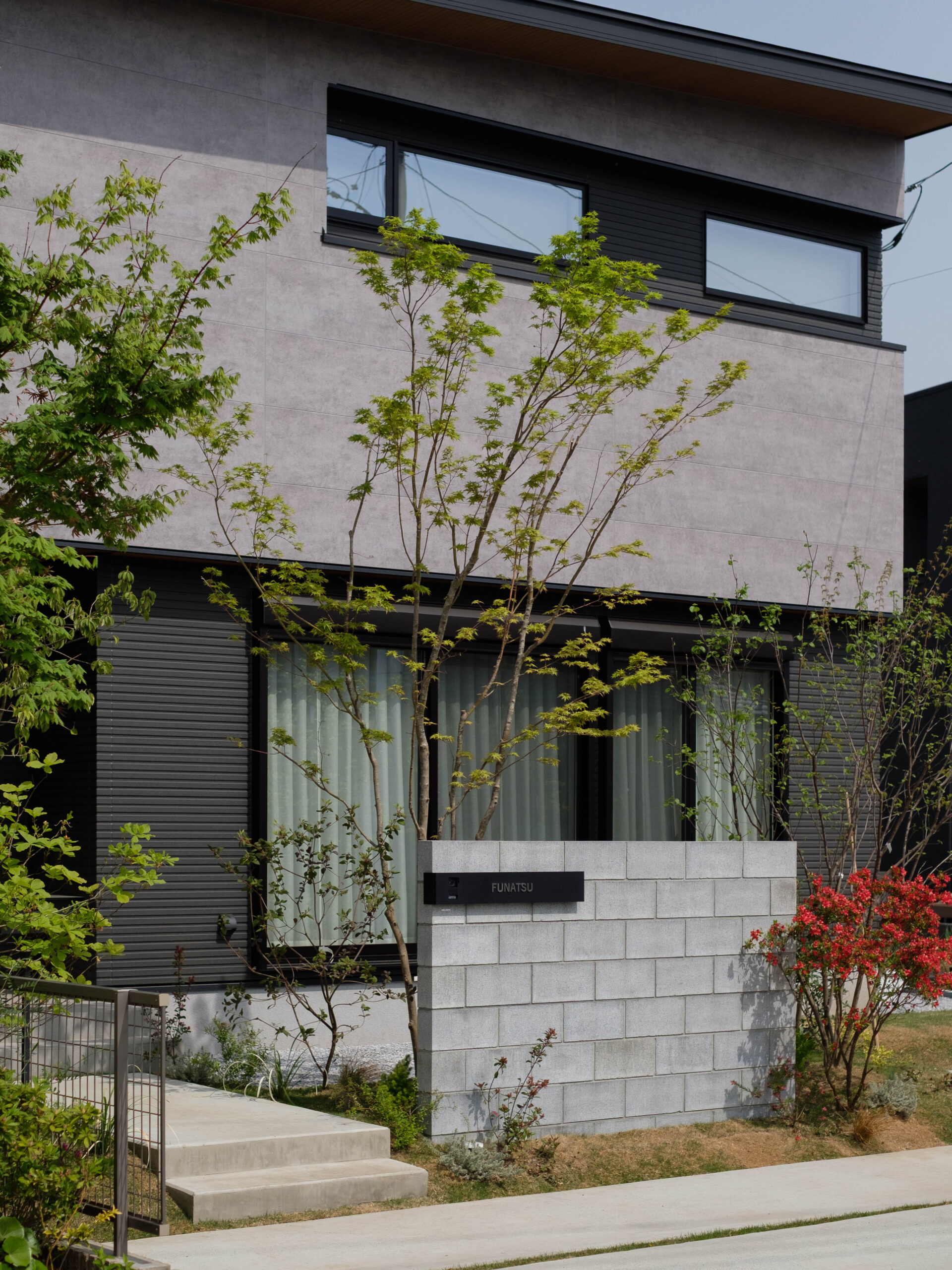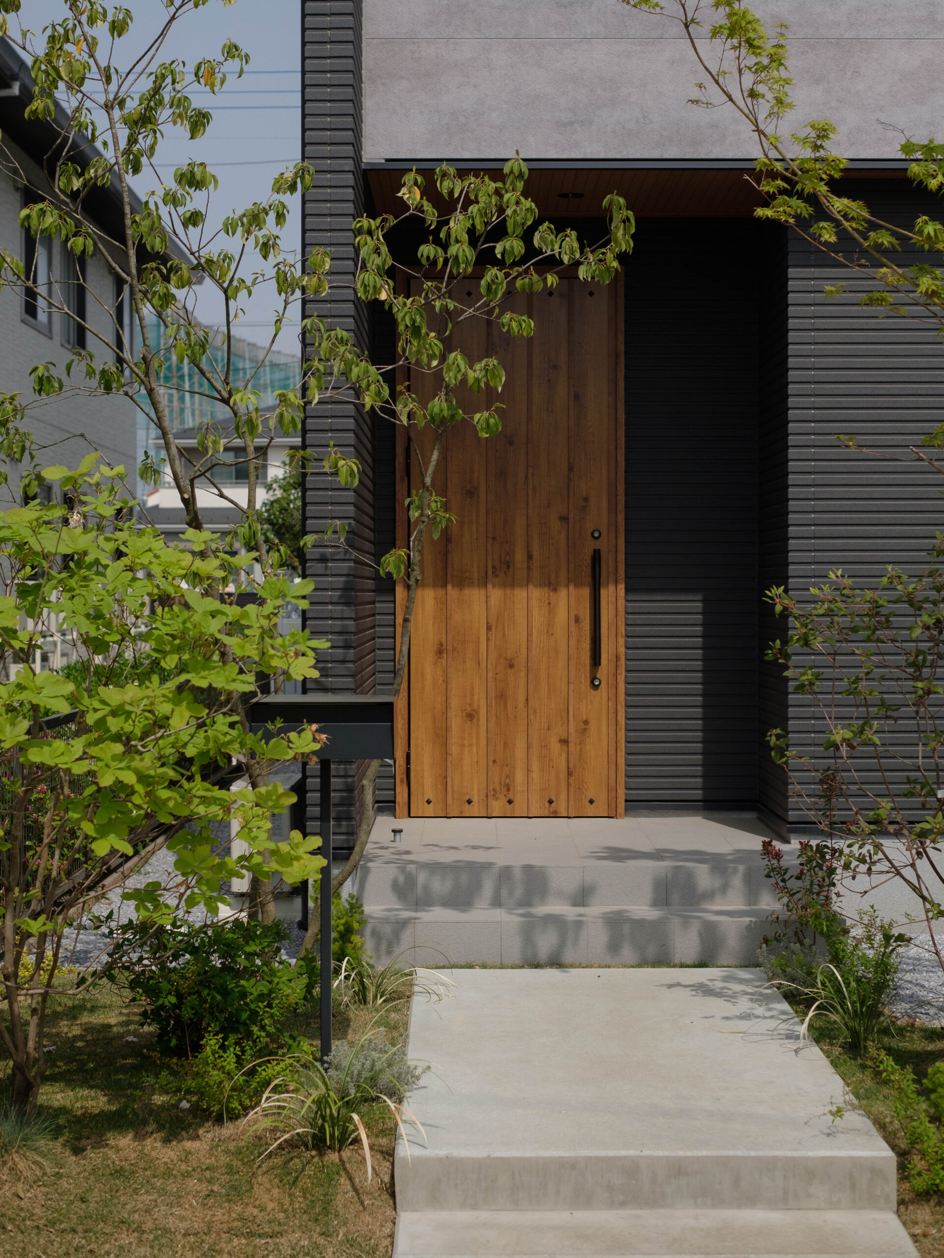 構造物は一枚の壁のみでありながら、建築スケールに見合ったボリュームの植栽をバランスよく配置することで、住宅外観が立体的に見えるよう工夫しました。