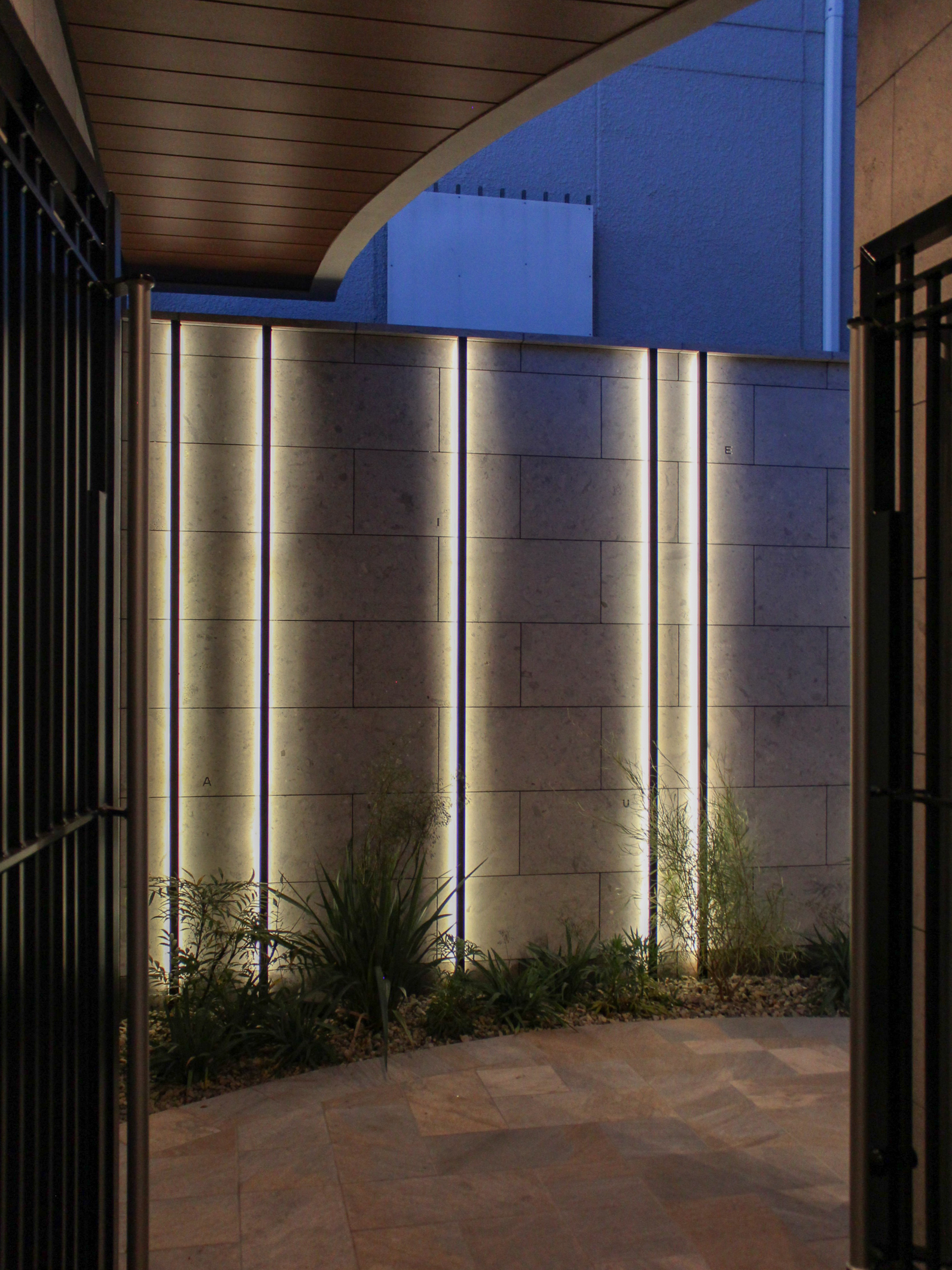 アプローチとシャッターゲートを一体型のRC構造とすることで、広がりのあるファサードを演出。